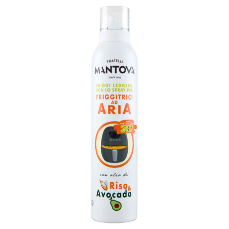 Mantova Olio Spray x Friggitrice ad Aria to specjalnie opracowany, wysokiej jakości olej roślinny w sprayu, stworzony z myślą o nowoczesnym gotowaniu w frytkownicach beztłuszczowych (airfryer). Dzięki praktycznemu dozownikowi pozwala równomiernie pokryć potrawy cienką warstwą oleju, zwiększając ich chrupkość i smak bez nadmiaru tłuszczu.